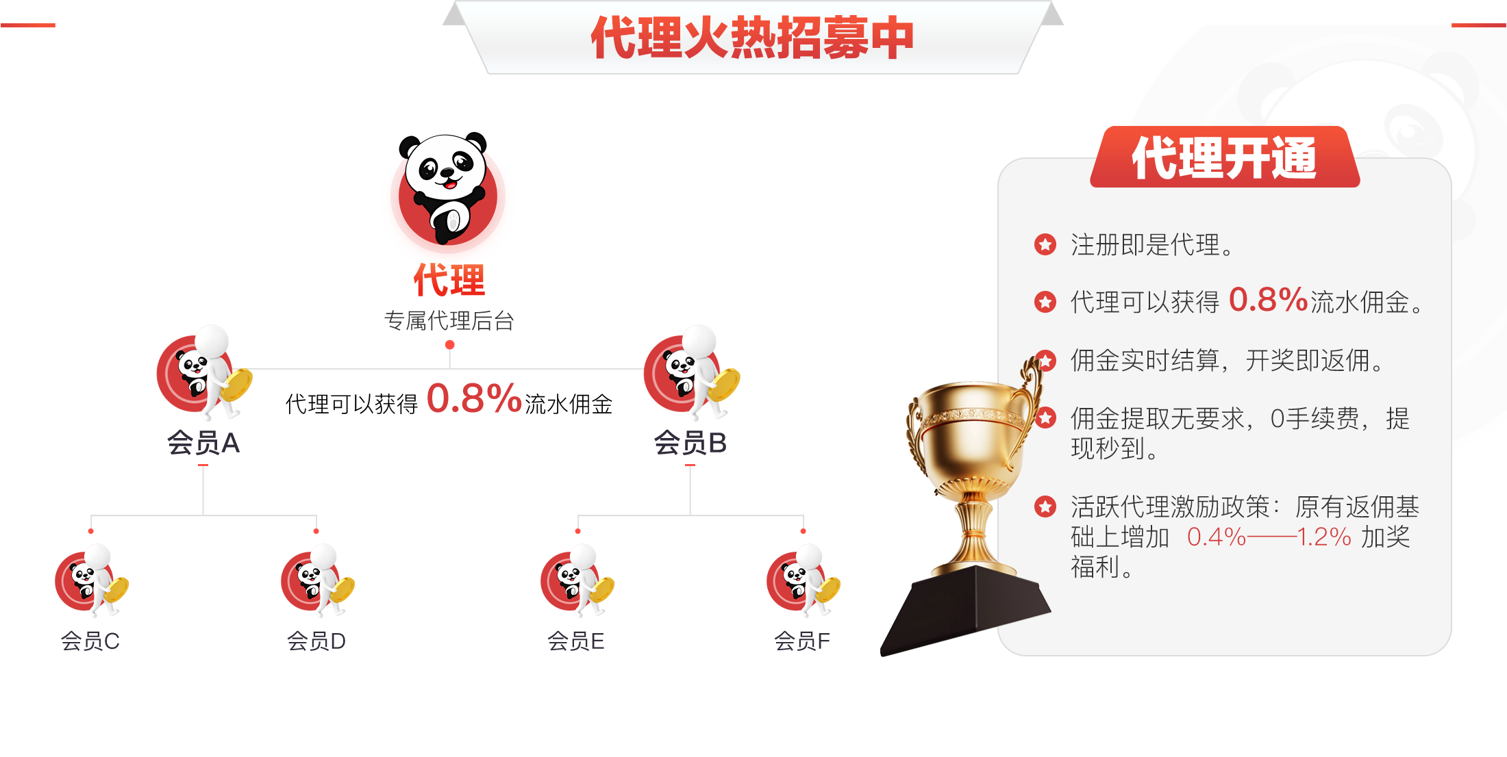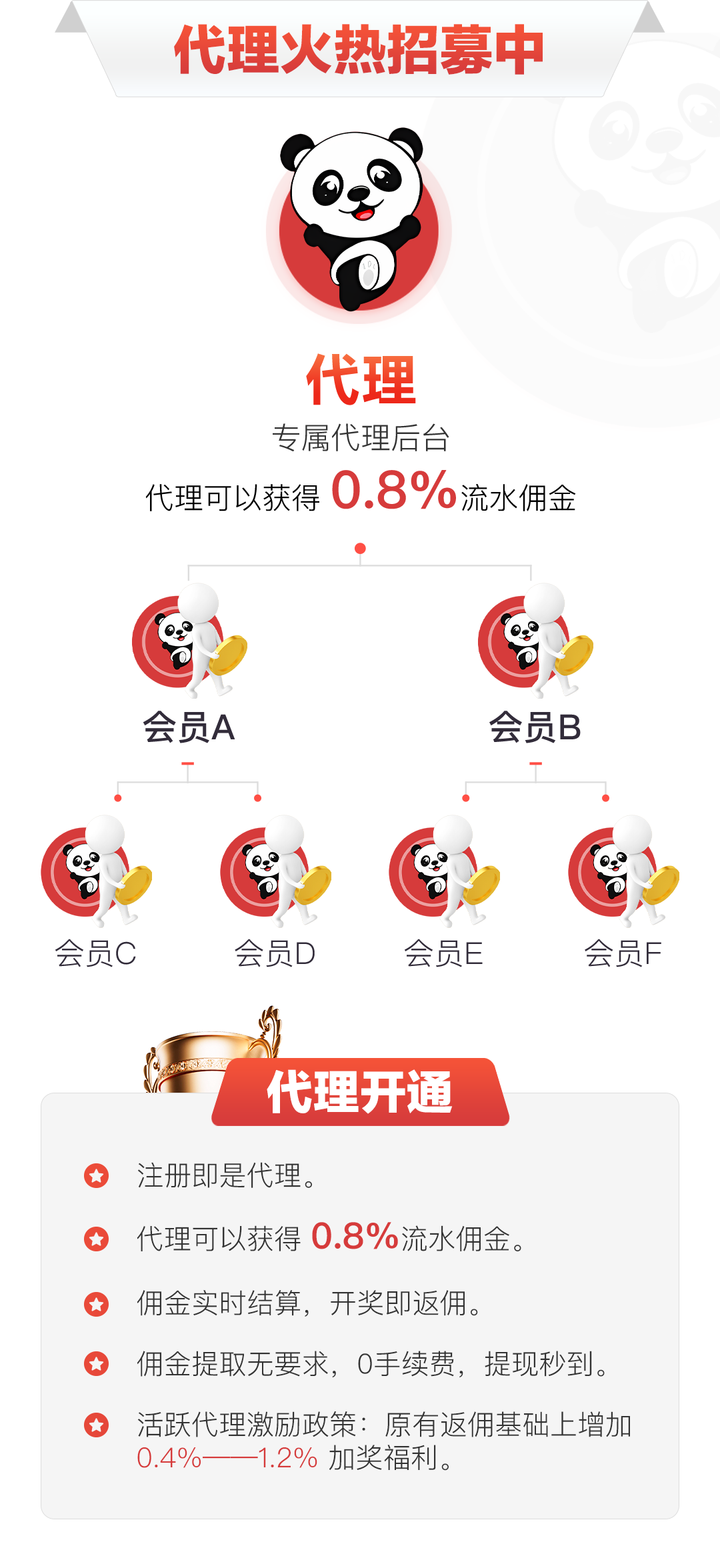 代理本人会员账号游戏,介绍的线下会员,以及会员继续介绍,代理通过后台,可以获得总的 0.8% 的流水佣金。
